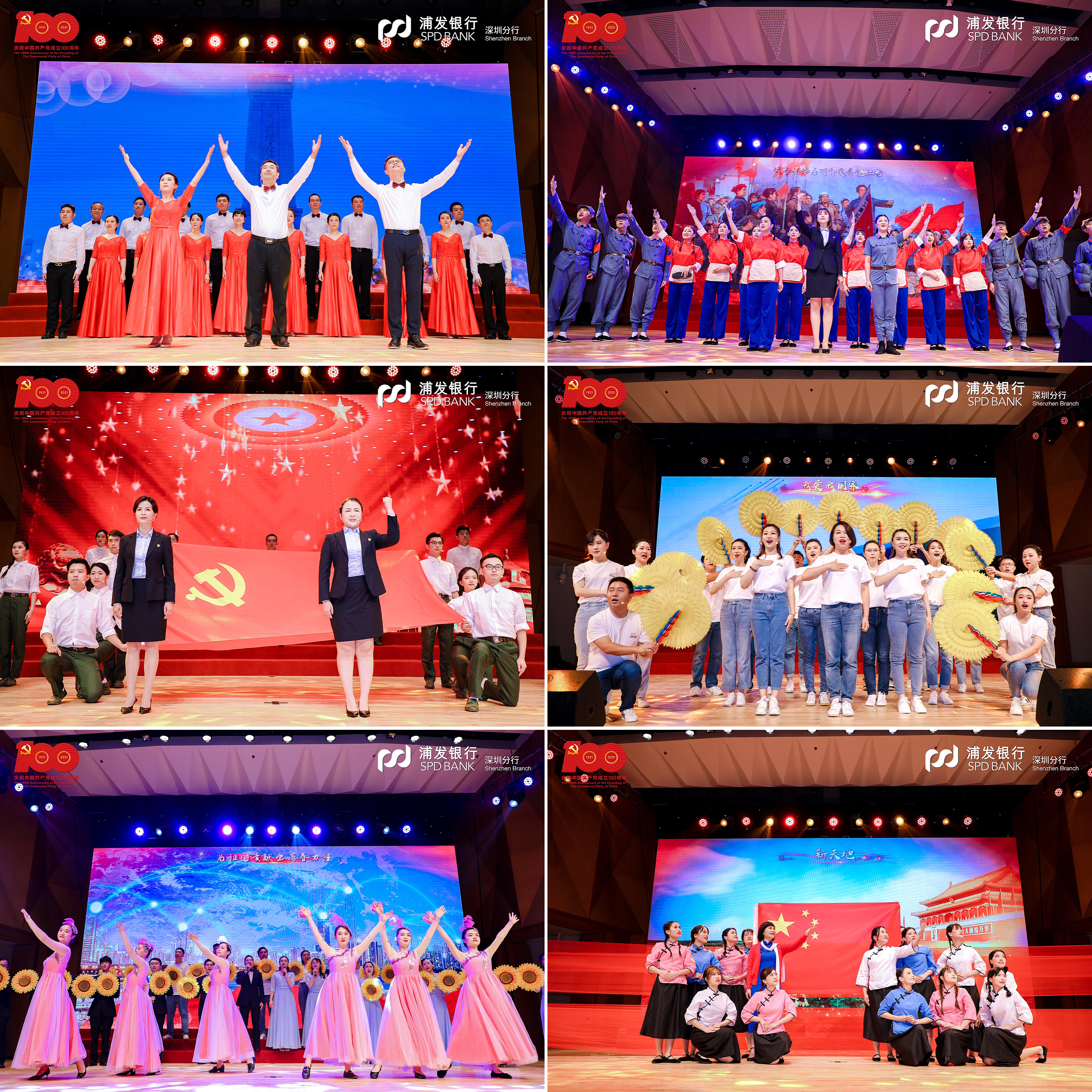 在党支部风采展示环节,该行基层党支部精心编排12首红色经典,通过4个篇章再现百年波澜壮阔的伟大历程。第一篇章“开天辟地”演绎了中国共产党在新民民主义革命时期完成救国大业的辉煌历程,《保卫黄河》吹响了高亢嘹亮的爱国号角,《十送红军》深情演绎血浓于水军民情,《绣红旗》一腔热血带着大家重回歌乐山。第二篇章“改天换地”回顾了中国共产党在社会主义革命和建设时期完成兴国大业的奋斗史诗,《歌唱祖国》拨动人们最难忘的记忆,《我们走在大路上》展现当年敢闯敢拼的奋进之姿态,《唱支山歌给党听》唱出人民心中永恒的赞歌。第三篇章“翻天覆地”再现了中国共产党在改革开放和社会主义现代化建设新时期推进富国大业的光荣壮举,《在灿烂阳光下》重现春风化雨之后的奋斗时光,《国家》打动多少人的赤子之心,《我们的生活充满阳光》诉说了改革开放背后的喜悦。第四篇章“惊天动地”展现了中国共产党在中国特色社会主义新时代推进并将在本世纪中叶实现强国大业的伟大时代,一首《天耀中华》是浦发人最深沉的表达,《灯火里的中国》让人漫步灯火漫卷的万里山河,《再一次出发》展示浦发追梦者的雄姿英发。走过“百年风雨”,浦发银行深圳分行合唱团一首《我和我的祖国》,蓬勃朝气尽显拳拳爱国心、浓浓赤子情。篇章结束,大家全体起立,高声合唱《没有共产党就没有新中国》,以最真挚最热烈的歌声献礼建党百年。