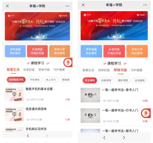 中信银行专门给老年朋友准备的“课程学习”一共有智能生活、悦享财富、琴棋书画和守护健康四大板块,都是老年朋友需要和关心的内容,总课程2000余节,总时长超过1.8万分钟。