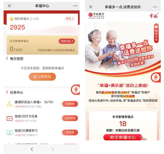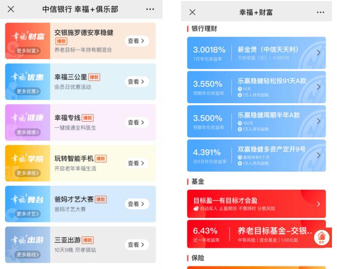 中信银行“幸福+俱乐部”“幸福+财富”页面展示