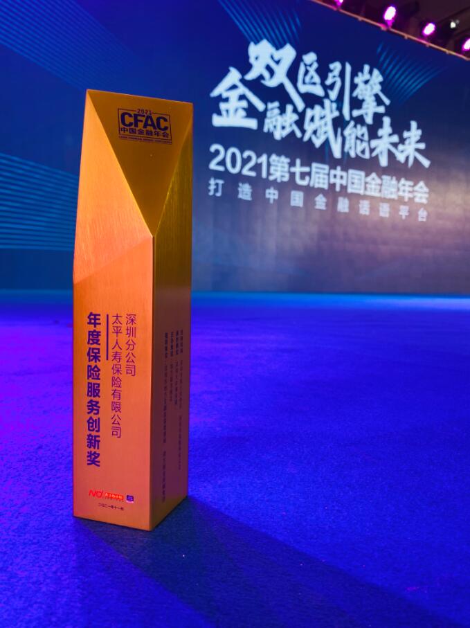 深圳新闻网2021年12月1日讯 近日,由深圳市地方金融监督管理局、南方报业传媒集团指导,南方都市报举行2021(第七届)中国金融年会,会上揭晓了2021(第七届)中国金融年会榜单,太平人寿深圳分公司凭借不断创新的保险服务模式、服务渠道,丰富的保险服务场景,完善的创新生态,一举摘得“年度保险服务创新奖”大奖。