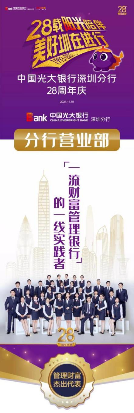 在成立28周年之际,光大银行深圳分行开展28周年“十大最美光阴故事”评选包括管理财富、服务民生、支持实体经济、创新金融科技、履行社会责任等五大领域,旨在评选出28年来在这五大领域的杰出案例,树立标杆,为分行发展打造“头雁”矩阵。引领分行各项业务迈入高质量发展新台阶。读懂了“十大最美光阴故事”,也就读懂了光大银行深圳分行的奋斗、执着和希冀。