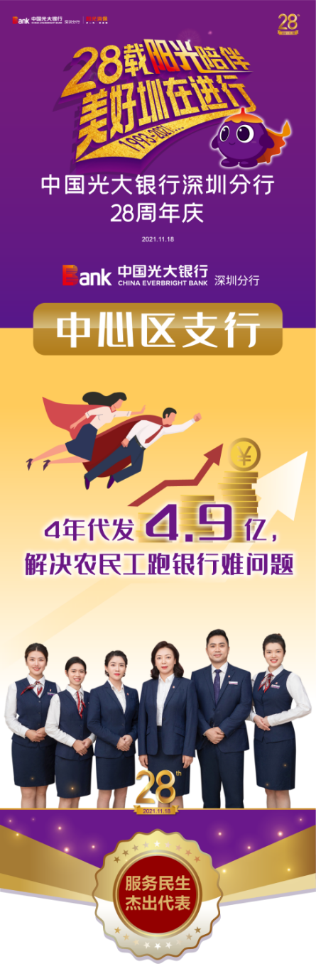 2017年,中心区支行与某建筑工程局达成农民工工资代发合作协议。4年来,该支行深入各项目工地为在深建设者上门办理开卡、金融知识讲座、防范电信诈骗、线上支付等业务百余次。截止2021年11月中旬中心区支行2021年全年新增个人客户数4422人,4年累计服务个人客户数11053人,实现代发金额4.99亿元,并克服郑州疫情、洪水天灾和跨省异地问题于10月中旬成功实现线上代发业务,解决了农民工跑银行网点难的实际困难。2021年已累计为各分公司农民工代发工资18279人次,累计新开卡9352张。