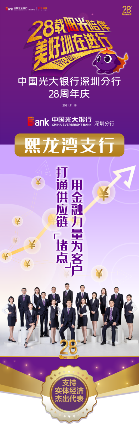 该支行始终秉承“客户满意,追求卓越”的价值观,用金融力量为客户打通供应链“堵点”,与一大批优质企业建立了良好的合作关系。截止2021年11月,支行在分行内对公客户数量排名靠前。因此,在深圳分行28周年“十大最美光阴故事”评选中,熙龙湾支行荣获支持实体经济杰出代表。
