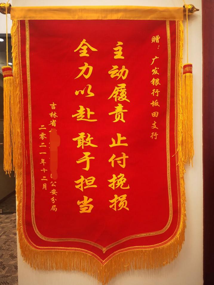 深圳新闻网2022年1月18日讯(记者 朱琳 通讯员 金桥)近日,广发银行深圳分行机智识别某公司账户涉嫌电信诈骗,成功堵截高达412万元的涉案资金转移。吉林省某市公安分局向该行授予锦旗,对该行有效保障人民群众财产安全的行为给予了高度肯定。