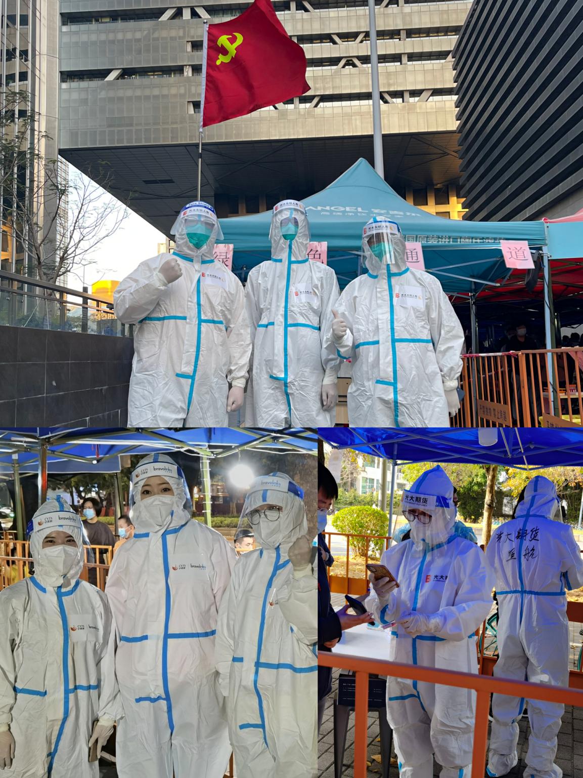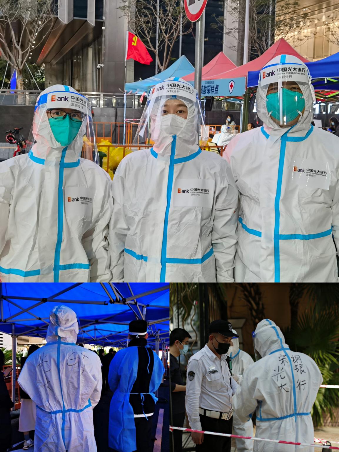 在疫情防控的关键时期,深圳分行党委坚决贯彻落实当地政府的防控要求,分行党委书记、行长韩学智同志紧急召开党委会议,启动应急预案,积极部署并投入疫情防控工作,确保日常营运和客户服务等工作有序运转。在深圳福田区金融工作局的组织与号召下,分行党委要求全体党员干部发挥先锋模范作用,主动为社区疫情防控工作提供志愿服务。分行党委委员们率先垂范,分头带领党员干部奔赴社区慰问抗战一线工作人员,并牺牲周末休息时间深入社区核酸采样点,脱下西装变身“大白”。深圳分行各党支部和团支部先后组织开展各类志愿服务累计时长超过100小时,活跃在防疫抗疫一线的同志们在全力保障广大群众金融服务需求的同时,和医护工作者一同守护着千家万户。作为集团驻深企业协同工作的牵头单位,分行牵头组建驻深企业志愿者先锋队,紧急投身福田区抗击疫情的各个战线和各个角落,不分昼夜、不论疲倦、以实际行动践行初心、使命和担当,弘扬新时代共产党人的奉献精神。“如果不是亲身体验志愿者服务工作,永远不知道抗疫人员的工作是如此辛苦!有多少人在负重前行才确保了深圳市民有序和安宁的生活。此刻很想拥抱可亲可敬的你们,防护服虽然阻挡了我们的拥抱,但无法阻挡我们一起抗击疫情的心。”一位志愿者这样记录到。