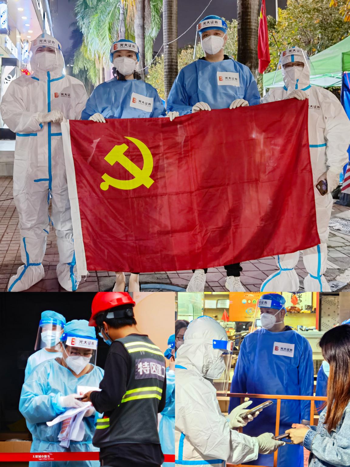 光大信托深圳区域党支部在接到协同抗疫通知后,第一时间组织党员和员工积极报名参与志愿服务。3月5日,恰逢毛泽东主席“向雷锋同志学习”题词的纪念日,光大信托公司风险总监姚恒民同志以年近6旬的高龄,率先垂范的冲在一线,带领深圳区域党员同志们,投入福田区莲花街道狮岭社区的核酸检测志愿服务工作,用实际行动和赤诚情怀书写共产党员的责任和担当。当天天气炎热,太阳暴晒下穿着防护服两个小时工作下来,全身已完全湿透,但他们以饱满的激情、负责任的态度诠释了一个共产党员在党旗下宣誓的誓言。光大信托的一位党员同志说:“疫情就是命令,防控就是责任,岗位就是战场,每个服务点的党旗就是一种信仰,每个党员就是一面旗帜,每个党支部就是一个堡垒,哪里有需要,哪里就有光大人的身影。”