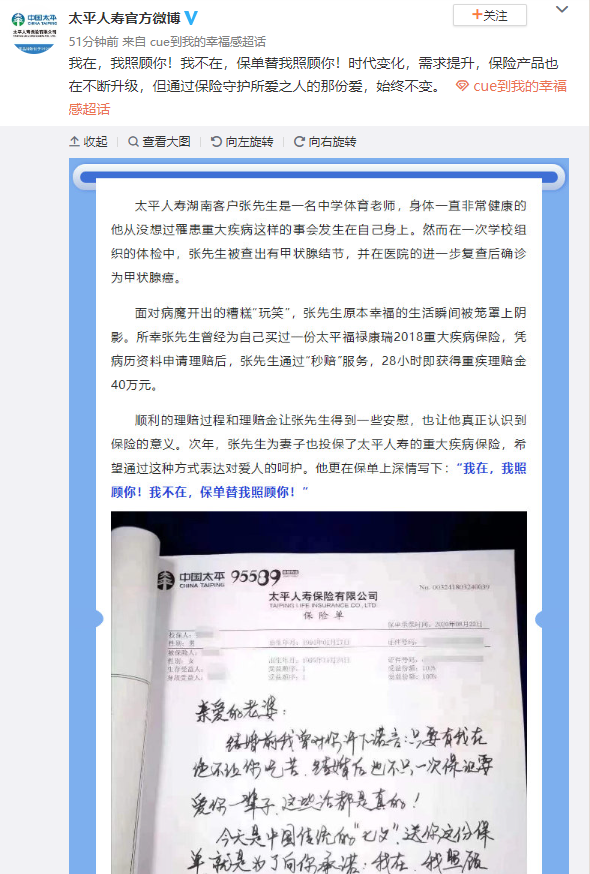 在微博的网络互动里,太平人寿积极发动内外勤及客户,讲述了幸福的生活趣事。
