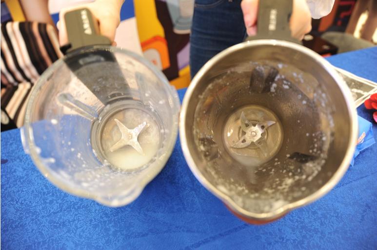 在活动现场,同样进行了清洗对比实验。工作人员分别使用静音破壁机和传统破壁机打米糊。我们在现场看到,把制作好的米糊倒出来后,两款破壁机的杯底对比非常明显,传统破壁机不仅有些糊底,而且清洗比较麻烦。
