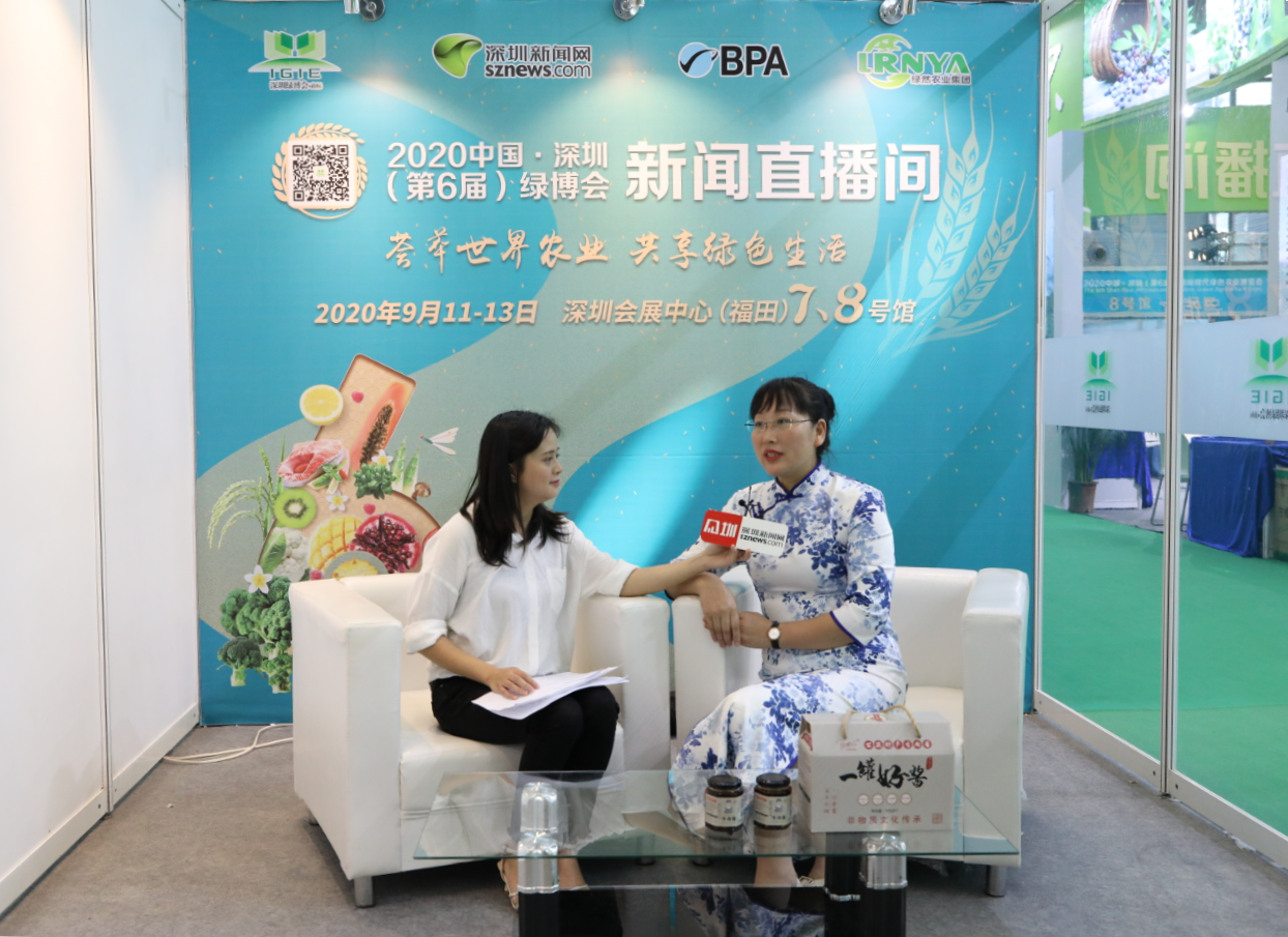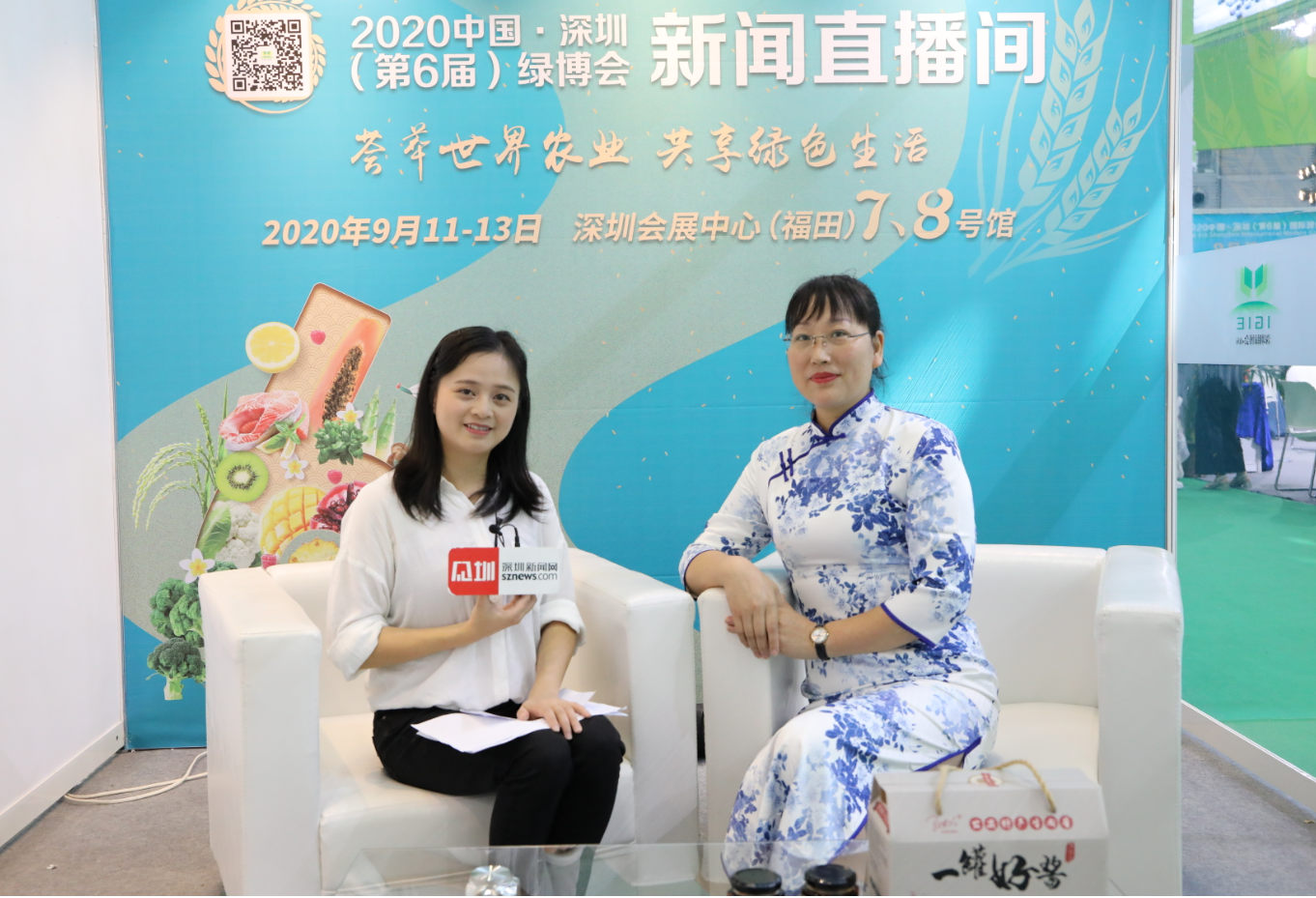 2020年第六届深圳绿博会上,荆州市酱香人家食品文化有限公司第四代传人翁仁花,在新闻网直播间接受深圳新闻网采访。
