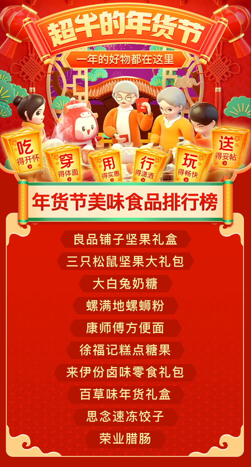 同时,受疫情影响,今年各地倡导“就地过年”,非必要不外出。消费者为了在异地也能享受年味十足的农历新年,地方土味年货、家乡美食产品等销量暴涨,其中广西螺蛳粉和广式腊肠走俏,赢得榜中两席。