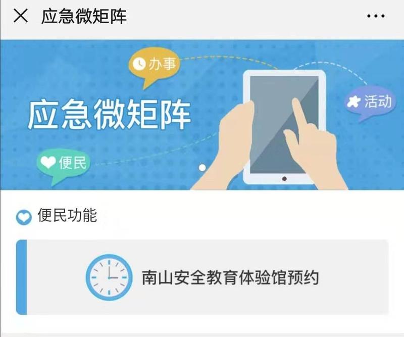 (3)关注“深圳应急管理”微信公众号,点击下方菜单栏“应急管理”-“应急微矩阵”,即可进入南山安全教育体验馆预约界面,进行在线预约。