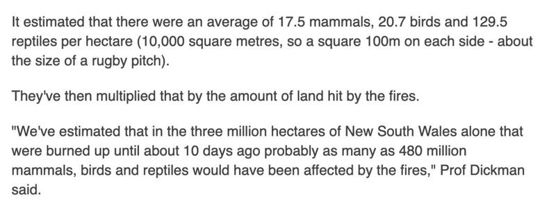 在澳洲300万的山火面积上,目前已经有:5200万的哺乳动物,6200万的鸟类,3.89亿的爬行动物,在这场大火中丧生!