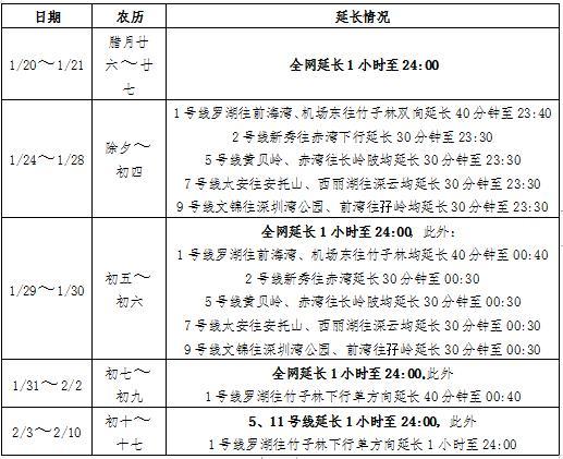 而2月3日至2月10日,地铁5、11号线全线,以及1号线罗湖往竹子林方向还将延长运营至24:00。