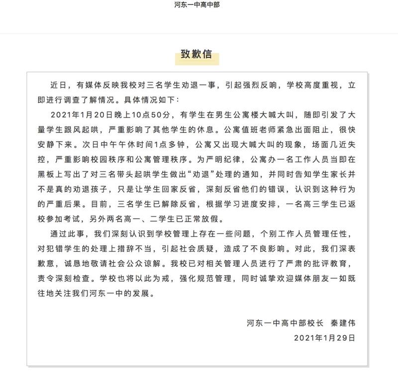 1月29日,“河东一中高中部”微信公众号发布致歉信称,当时公寓办一名工作人员在黑板上写出了对三名带头起哄学生做出“劝退”处理的通知,并同时告知学生家长并不是真的劝退孩子,只是让学生回家反省,深刻反省他们的错误,认识到这种行为的严重后果。