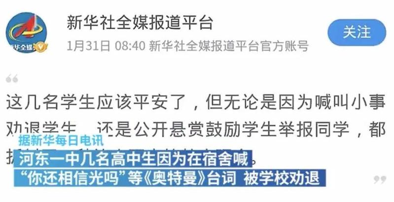 据报道,近日,山西运城几名高中生在宿舍喊“你还相信光吗”等奥特曼台词,被学校劝退处理。学校还发布悬赏公告,鼓励大家举报。