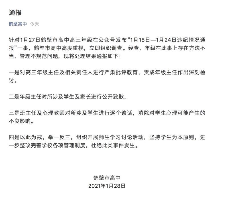 此前,据报道,微信公众号“鹤壁高中2021届”发布了一篇名为《1月18日至1月24日违纪情况通报》的文章,文内列举了95条各班学生违纪的情况,并具体到班级、学生姓名和违纪扣分原因。