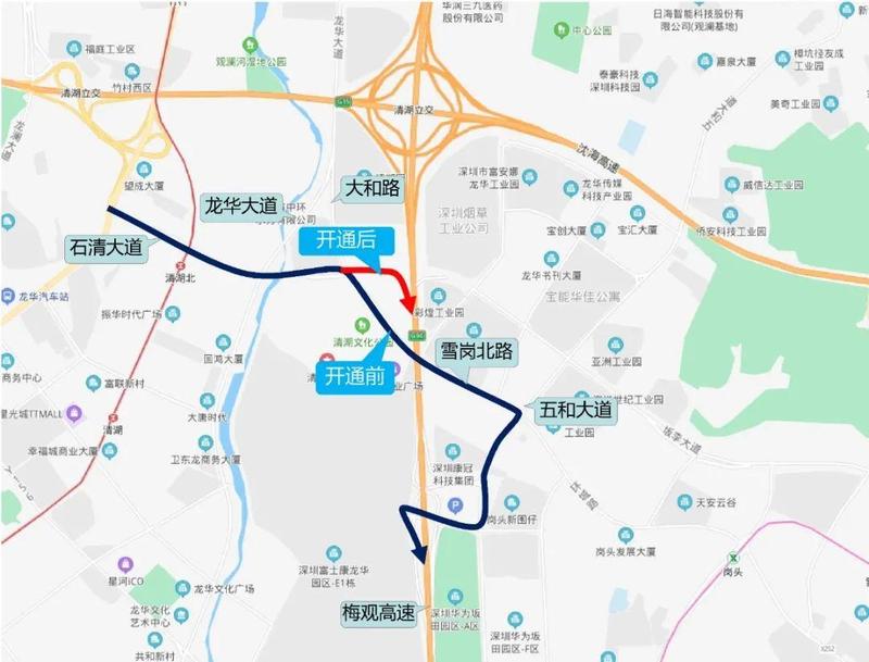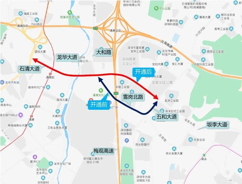 该路段通车后,清湖片区来往坂田、布吉方向车辆无需绕行大和路及雪岗北路即可直达坂李大道(图示红色箭头)
