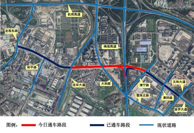 新建龙湖立交跨线桥,连续上跨大和路与梅观高速,为东西走向车辆出行提供了便利。