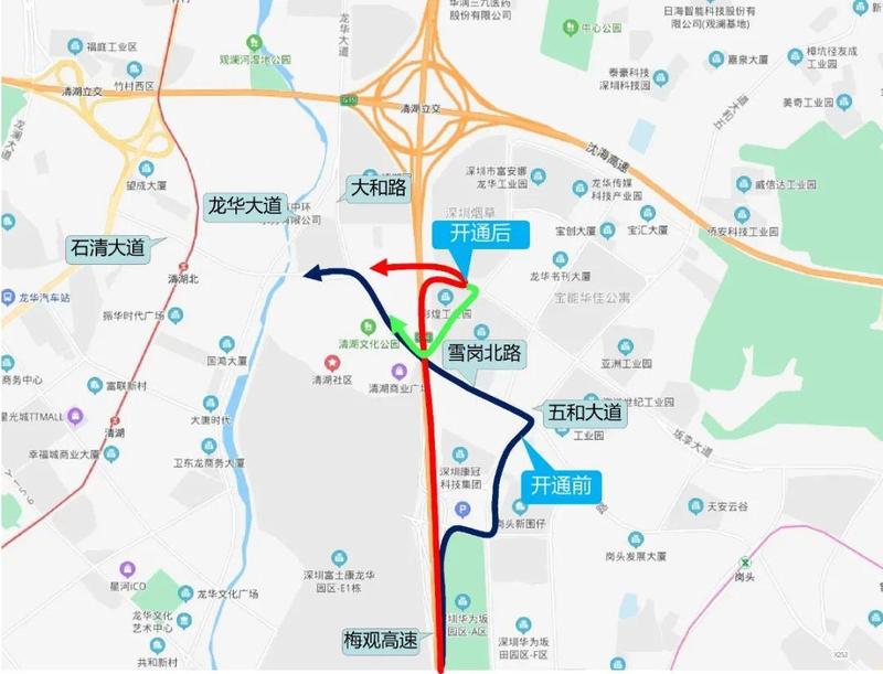 此外,该路段通过增设连接梅观高速进出市中心区方向的匝道,清湖及以北片区车辆无需绕行大和路、雪岗北路、五和大道,可经龙华大道及石清大道辅道直接进入梅观南行方向(图示红色箭头)