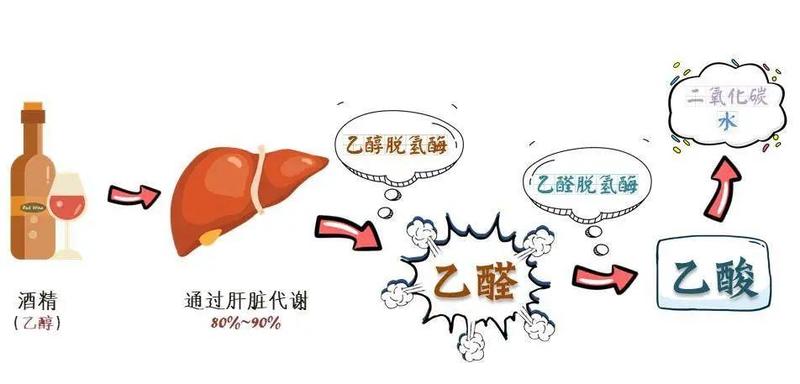 酒精在肝脏中的代谢,共分为两个化学反应过程。