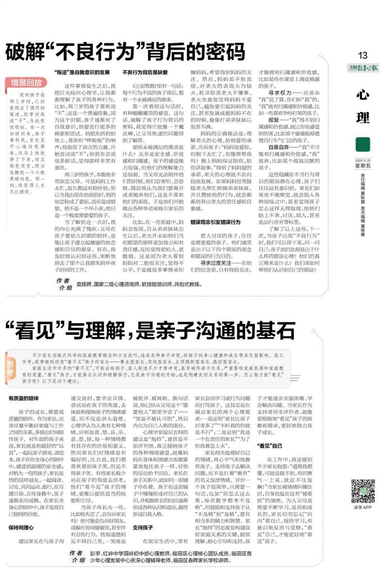 本报《家校》《心理》栏目长期面向广大教育工作者和家长征稿,如有关于家庭教育或学生心理相关的经验或思考,可私信后台回复“投稿”获取投稿邮箱,期待您的来稿。