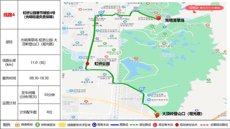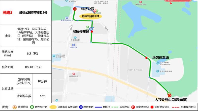 接驳线路(往返):光明农场大观园/滑草场←→农科中心←→虹桥公园←→茶林路←→华强创意产业园←→大顶岭登山口(观光路)