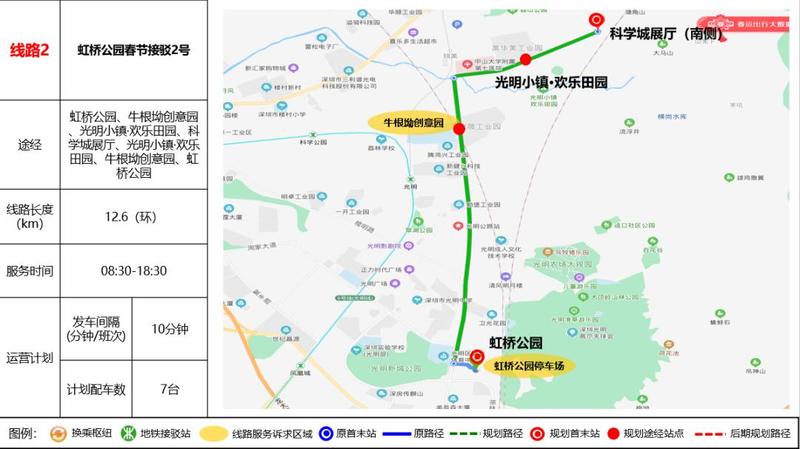 接驳路线(往返):虹桥公园←→牛根坳创意园←→光明小镇·欢乐田园←→科学城展厅