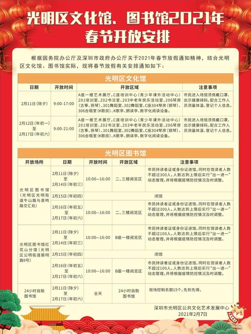 光明区图书馆新馆(位于光明街道牛山路与泉鸣路交汇处)于2021年2月5日起开放二、三楼阅览区服务,具体区域包括二楼的经典阅览室、乐龄阅览室、多功能学习室、青少年阅览室、24小时自助图书馆,以及三楼的社会科学阅览区。疫情期间,开放区域实施限额,同时在馆人数不超过300人,实行“一进一出”制,并根据疫情防控情况进行动态调整,读者来馆无需预约。须持读者证或身份证在正门入口处登记。