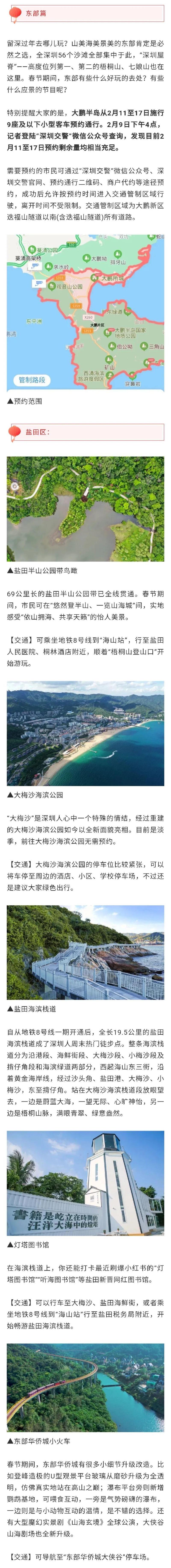 温馨提醒,春节期间位于宝安福永的凤凰山森林公园施行人流管制,入园需提前预约。光明区大顶岭绿道、虹桥公园门票免费,但需提前一天预约(当天现场预约会视情况放出少量现场预约号),建议欲前往的市民提前一天预约。(具体可预约时间以官方发布为准)