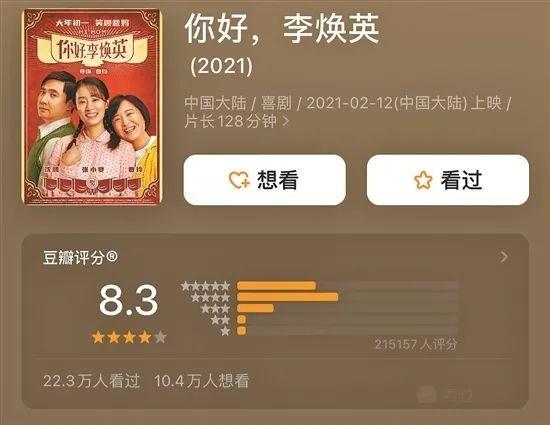 作为贾玲送给意外过世的妈妈的“礼物”,《你好,李焕英》凭借诚挚的情感表达打动了无数观众。网友纷纷给该片打出高分,截至2月15日18时,《你好,李焕英》在豆瓣得分8.3分,是春节档迄今唯一的“8分选手”。