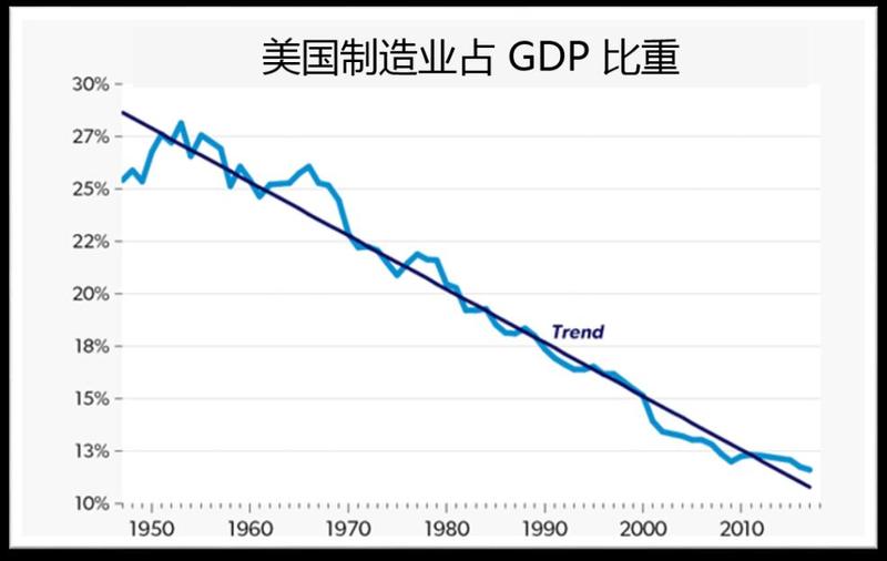 20世纪50年代以后,美国开始去工业化,金融、房地产等虚拟财富大幅增长,产业空心化成为美国经济的一大隐忧。制造业占GDP比重从1953年的28.12%下降至2019年的11.39%。