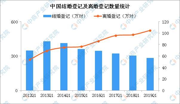 2019年一季度结婚及离婚人数统计:结婚人数跌破300万对。