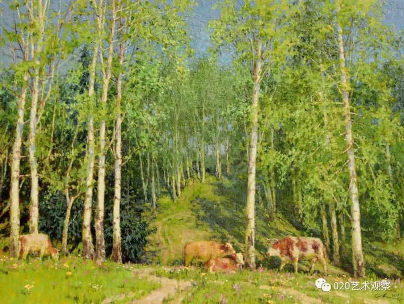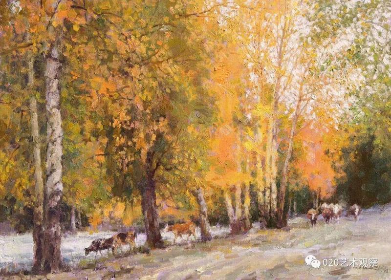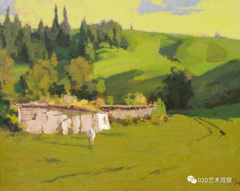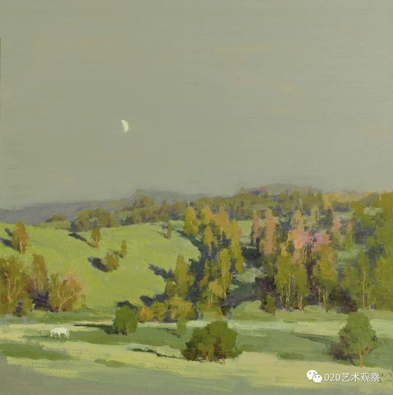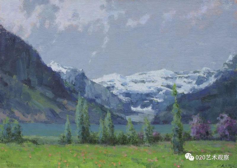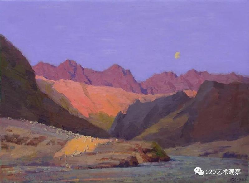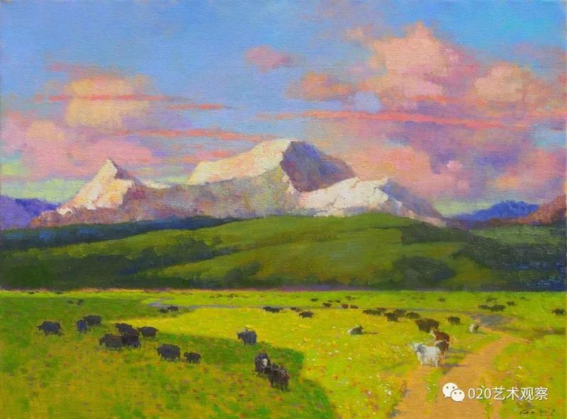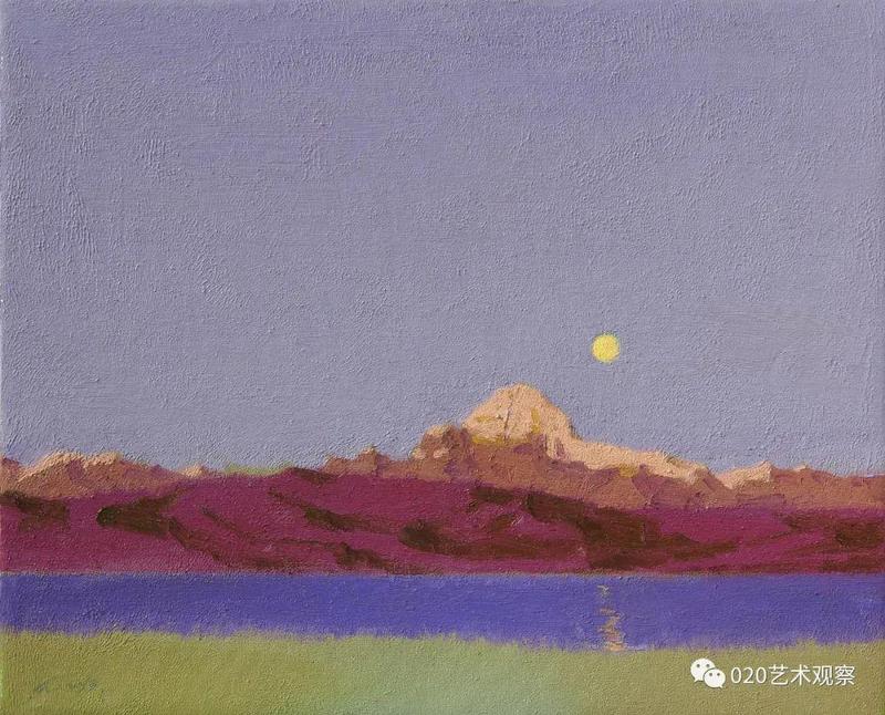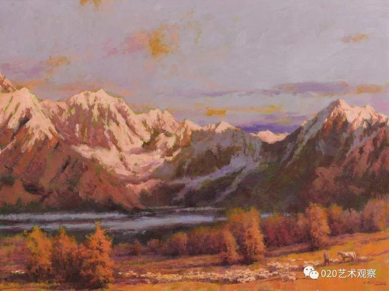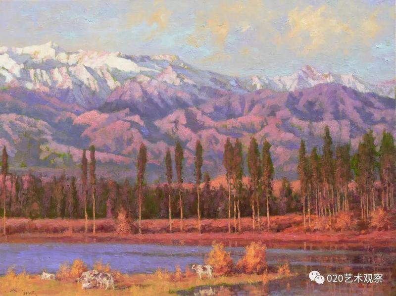 退休前后,他去西北西南地区写生、采风十多次,每次回来几乎是满筐满筴的创作构想,他把那阵阵激情逐渐地幻化成笔下创作:白雪皑皑的远山,高耸连绵的白杨,玫瑰色的晚霞,像白云般的羊群......露出半边脸的初月,绿色茵茵的白桦树林,长城蜿蜒于血红的残照之中......这一系列的敍说也难于将黎楚池的西北画作道尽。一时不再是小桥流水,落花片片,眼前尽是:”明月出天山,苍苍云海间,长风几万里,吹渡玉门关。“一个南国青年到老都那麽迷恋北国风光,反复描写,反复吟咏,他让这些边疆的山与水有了新诗意,有了新面貌,再也不是“西出阳关无故人”的凄凉之境了。她雄伟,她神奇,充满了苍茫的诗意,黎楚池用饱满的色彩为我们叙说了新的西北故事。
