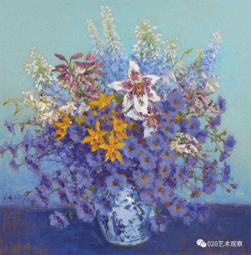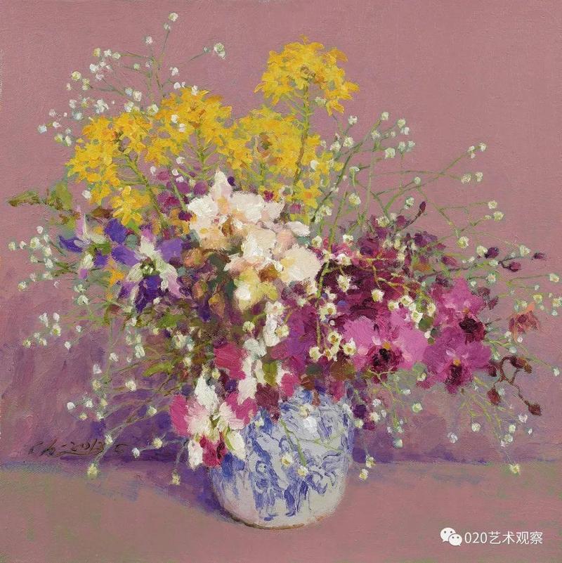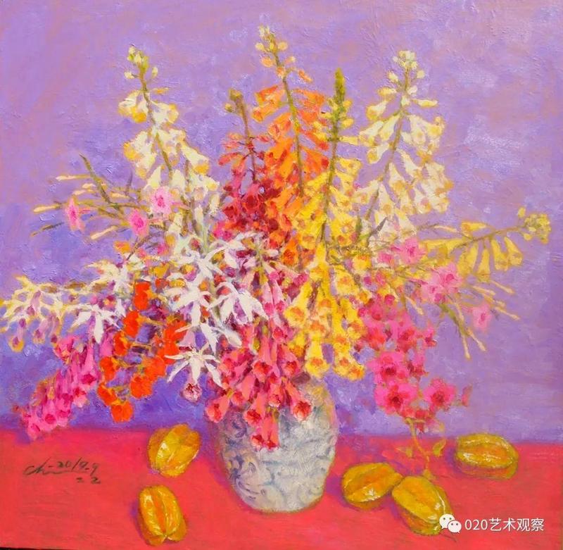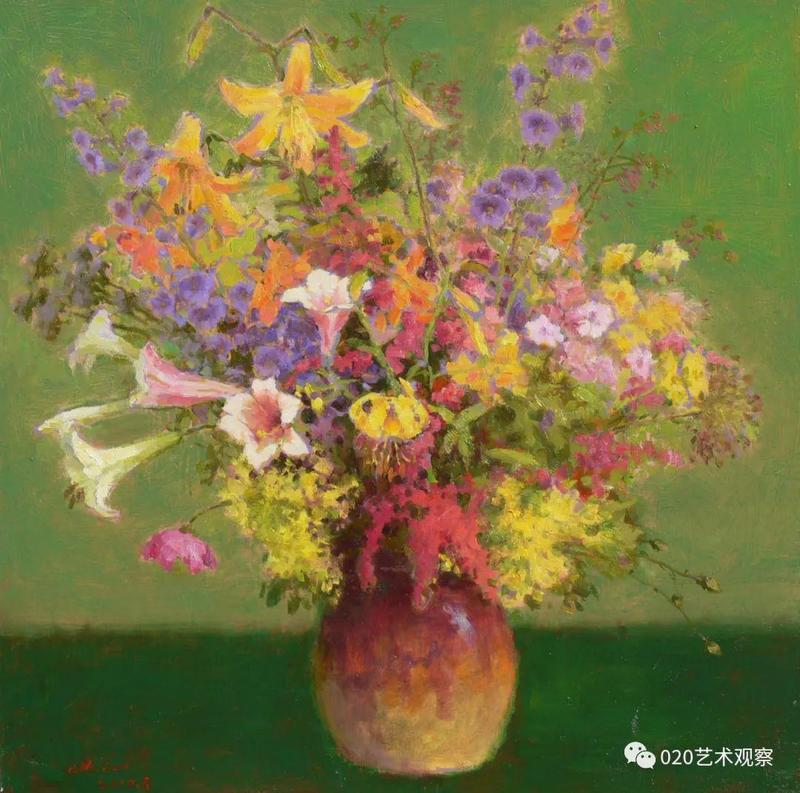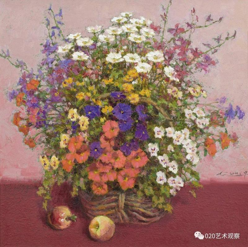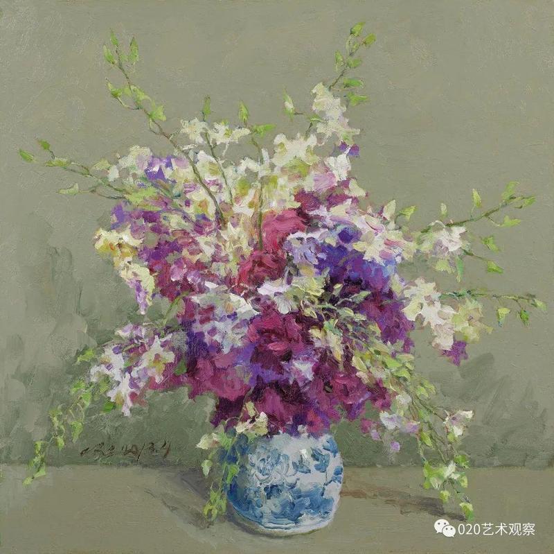 最近,他对风景画作了一些大片简化的处理,又将此举延伸到静物花卉,带出一片清新与明快,真叫人情不自禁地鼓掌喝采:这个精壮汉子,这个永不停脚的人:说不尽的南腔北调语,画不完的高高秋月下长城。