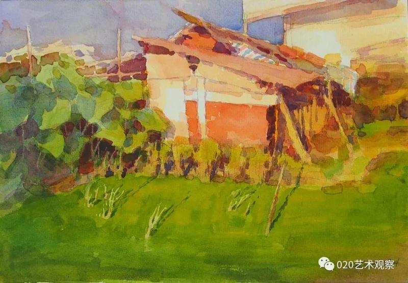 在深圳转入美术行政工作后,他作画更勤了,除大量写生外开始寻找广东原乡的土地形象,和土地语言。这是“瓜棚”水彩画作的由来,那时的时代特徵是一边高楼耸立,一边是宝安城郊遍地环绕的水田、瓜棚,鷄声、牛哞。《瓜棚》系列画作的出现不仅是他对瓜叶叠翠不厌的描绘带来的喜悦,也是一种怀旧,一种对田园诗情无尽的眷恋。