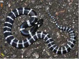 银环蛇俗称雨伞节、银脚带,是眼镜蛇科的成员,毒腺很小但毒性强烈。都说毒蛇长着三角形的大头,银环蛇却是小头,可见这种说法并不可靠。银环蛇的横截面呈三角形,身体黑亮,均匀地分布着白色的环斑。银环蛇在夜间活动,多栖息水边,以鱼、蛙、蛇、鼠为食物。虽然银环蛇是毒蛇,但是它们性情温和,遇到惊扰后就会迅速逃走。