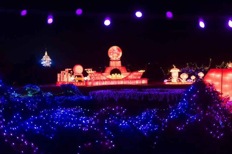 到踏入海上田园可以看到整个海上田园流光溢彩,灯火辉煌,迎新灯会总游览面积超5万平米,精心设计分为5大主题、36组大型灯组,上万盏灯点亮海上田园的主游览路线。
