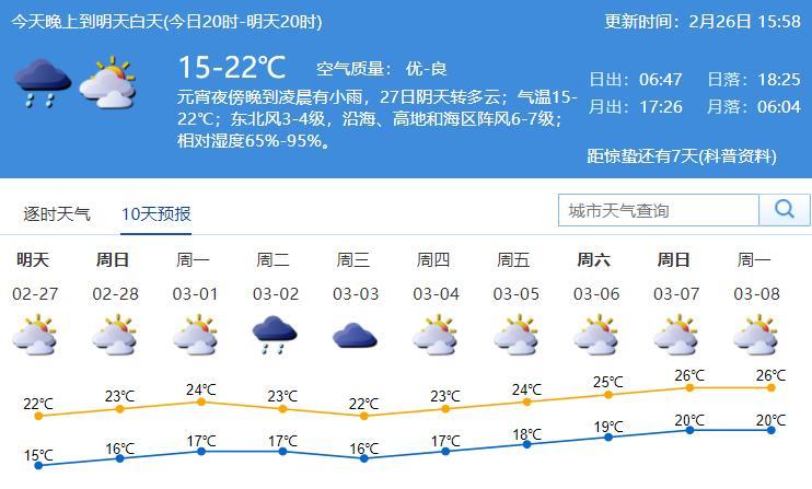 元宵夜傍晚到凌晨有小雨,27日阴天转多云;气温15-22℃;东北风3-4级,沿海、高地和海区阵风6-7级;相对湿度65%-95%。