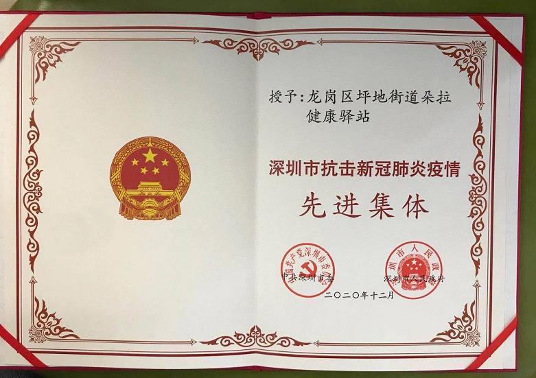 ▲坪地朵拉健康驿站荣获“市抗击新冠肺炎疫情先进集体”