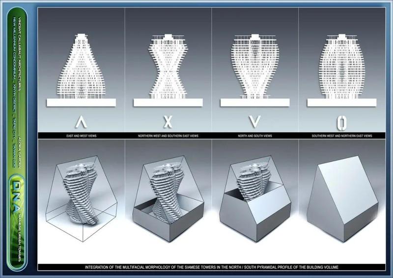 住宅公寓楼的每一层都按顺时针方向旋转4.5°,从不同角度观赏大楼,会呈现出不同的外貌造型:V形、X形、椭圆形和锥形。