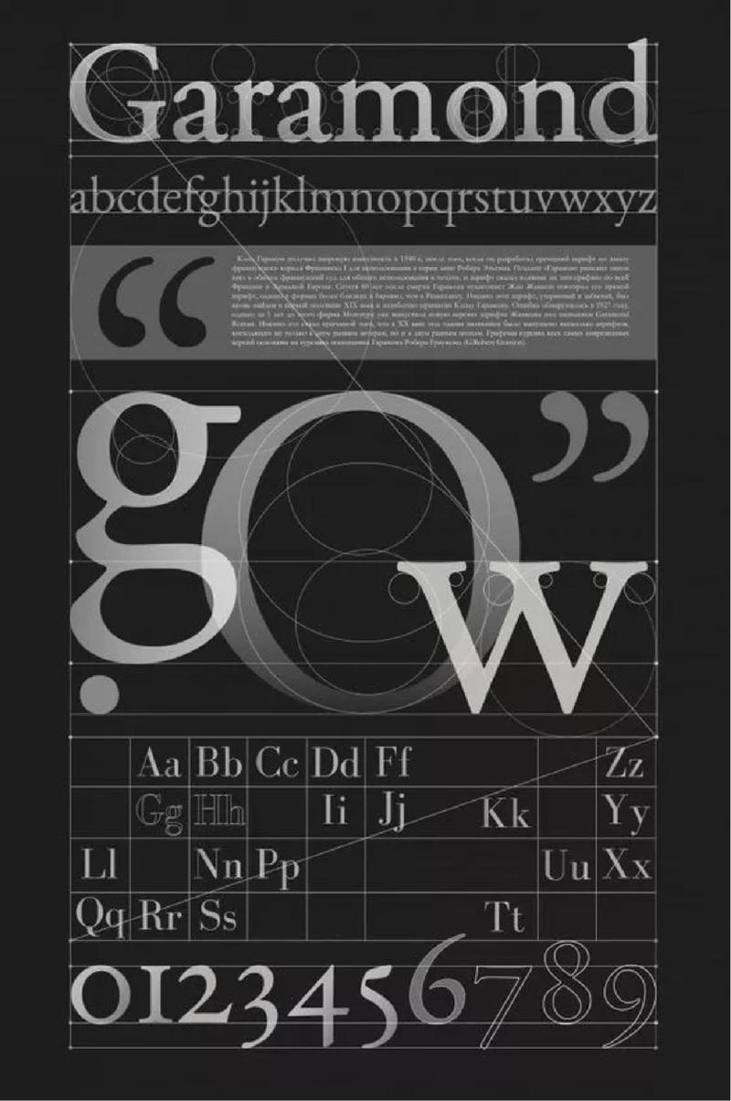 Garamond(加拉蒙)是非常经典的旧衬线体,字体优美清晰,雅致庄重、圆弧形衬线过渡流畅自然。