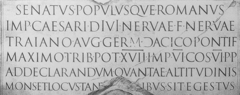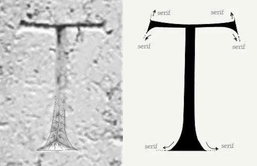 这种装饰线的笔画设计多认为来源于古罗马纪念碑上的拉丁字母,1968 年 Edward Catich 神父在著作《The Origin of the Serif》中提到罗马字母最初被雕刻到石碑上之前,要先用方头笔刷写好样子,再照样雕凿。由于直接用方头笔刷书写会导致笔画的起始和结尾出现毛糙,所以在笔画开始、结束和转角的时候增加了收尾的笔画,也就自然形成了衬线。
