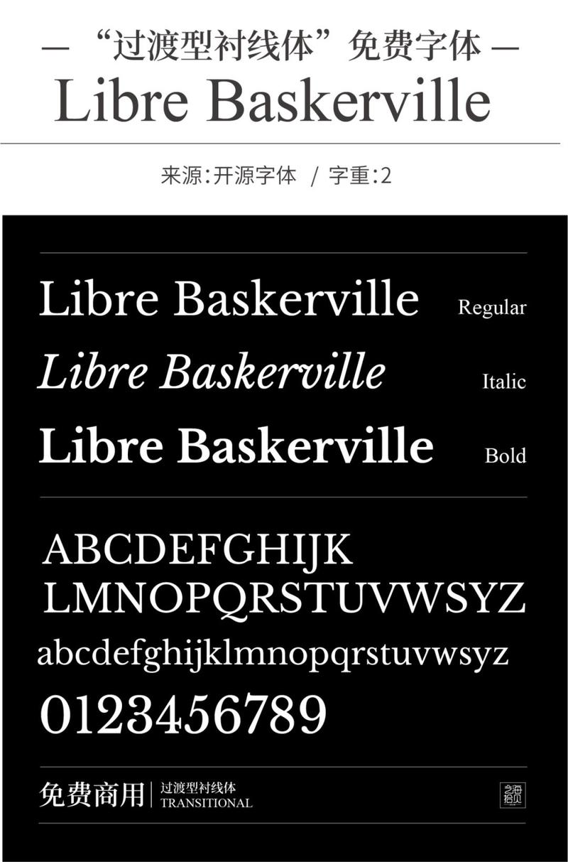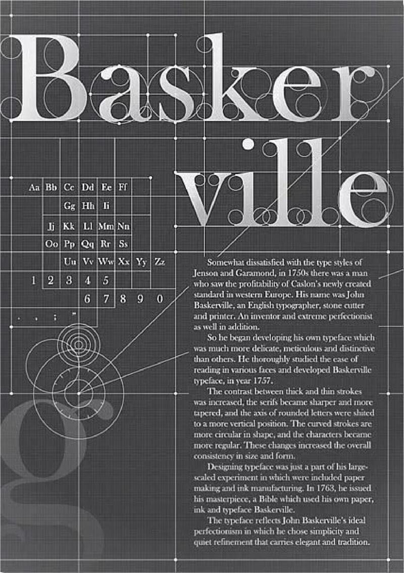 Baskerville(巴克斯维尔体),诞生于英国却最先流行于美国的字款,早期美国政府的官方公文字体。给人古典、高贵的感觉。