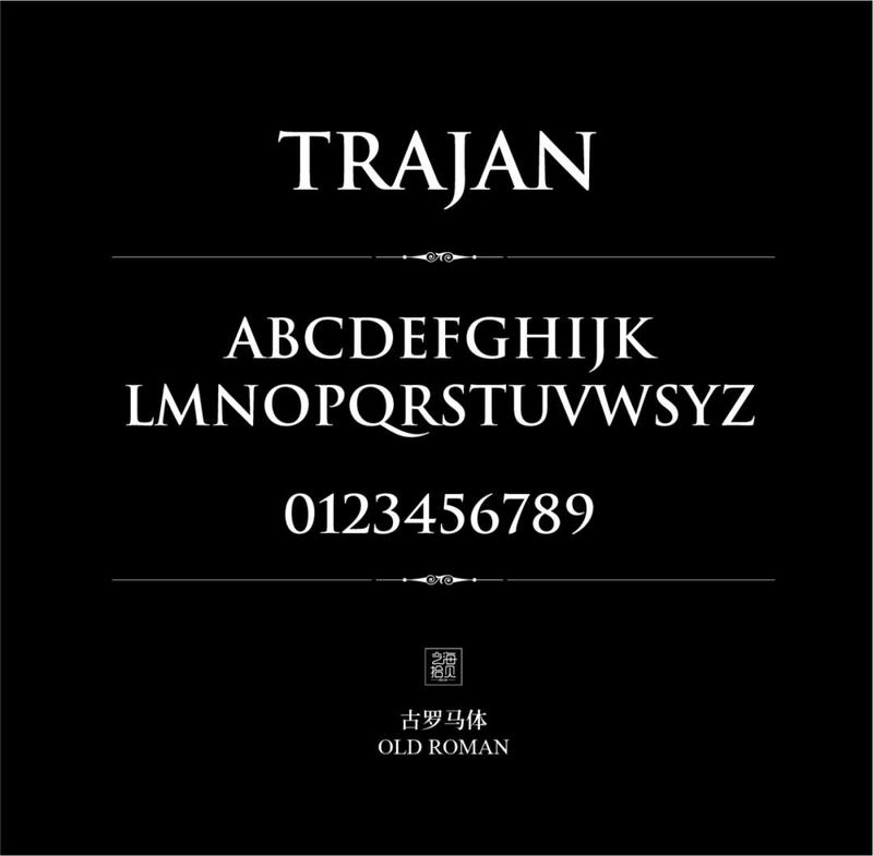 Trajan(图拉真)继承了古罗马字形特点和比例特征,传达出古典的传统感和非常经典的气质,由于罗马时代还没有使用小写字母,因此字体全部都是大写字母。