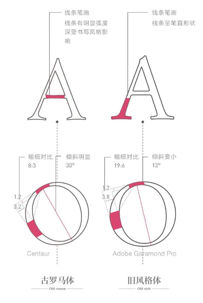 旧风格衬线体O字母较细部分连线依然是倾斜的,但字母宽度差异较小,笔画粗细过渡较缓和,括弧型衬线,复古传统,易于阅读。
