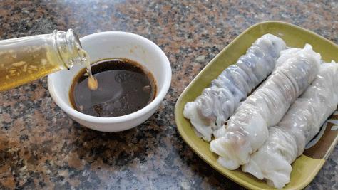 除了余记餐厅,你还可以尝试另一家越南肠粉店,名字就叫做“越南肠粉”,强烈推荐店里的杂肠四拼,每条都是不同口味,有鲜虾肉肠、叉烧肠、芋丝肠、木耳肉肠四种,一次性吃到店里的四种口味。和余记不同的是,这里的酱汁是自己调制的酱汁,再加上加了蒜粒、辣椒的甜酸汁,把整条肠粉放进去泡十几秒再吃,口感更丰富。