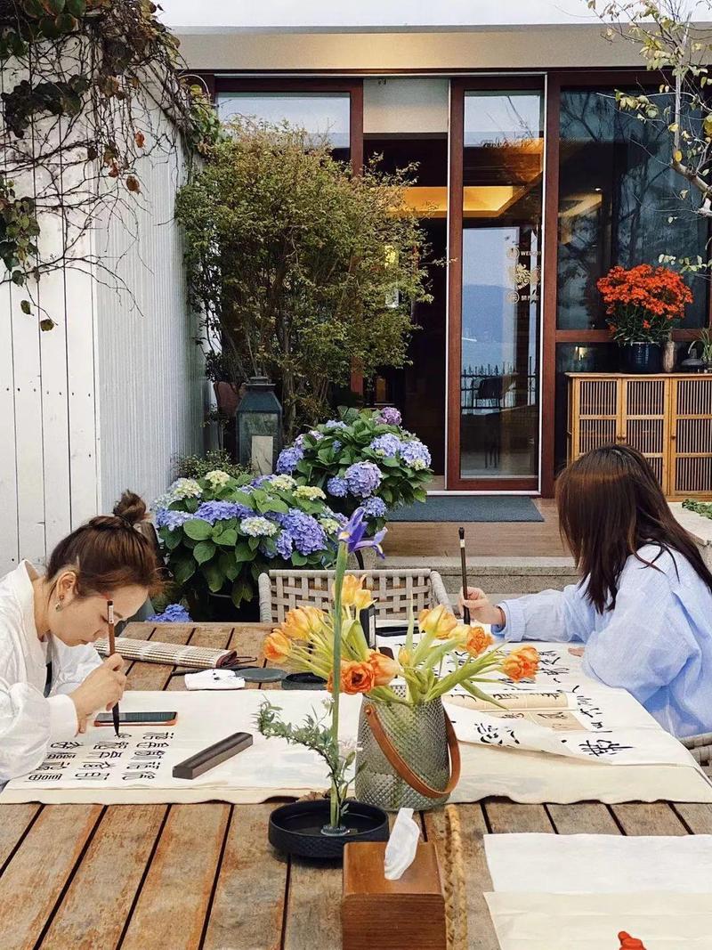 于是当天几乎所有房客都参与了这场的“书法沙龙”,从自己的房间抱来零食酒水,一群人以字会友、把酒言欢,这或许就是民宿之于酒店截然不同的地方。