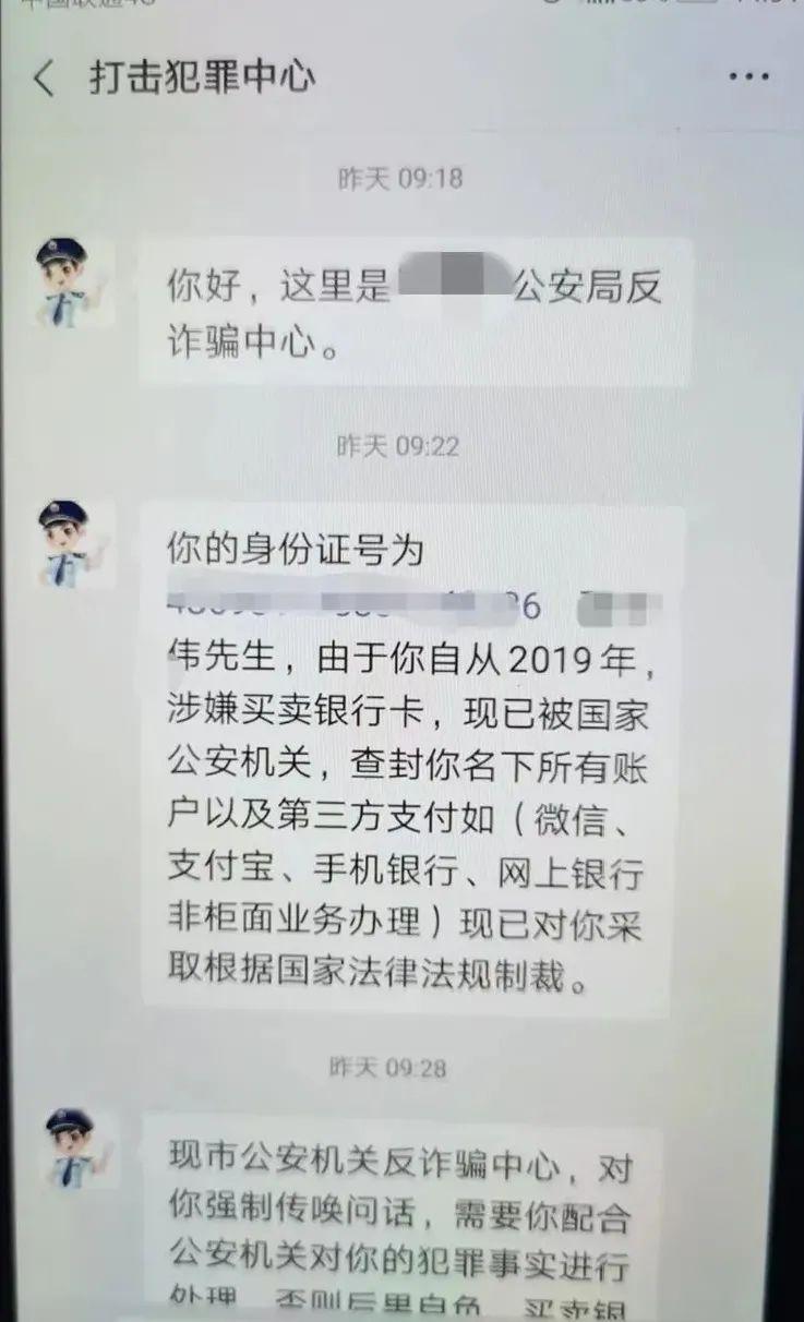 添加成功后,他先是给刘先生看了自己的警官证,随后在对话中称刘先生涉嫌买卖银行卡,现会对刘先生名下的所有账户及第三方支付账号进行查封,并要采取强制措施。