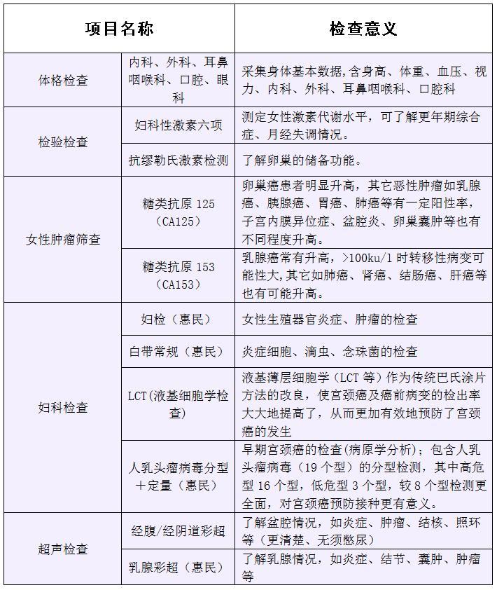 意义:在方案1的基础上进一步了解宫颈癌高危因素检测、增加对乳腺癌,卵巢癌筛查及卵巢功能的检测。