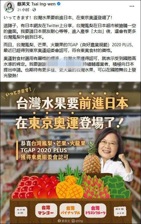 12日晚,蔡英文也在脸书发文宣称,“台湾水果要前进日本、在东京奥运登场了。”她还说,台湾凤梨、芒果、火龙果的TGAP(良好农业规范)2020 PLUS,最近已经得到东京奥运组委会认可,符合东奥食材的资格,并且很快她的帖文就得到了“立委”的吹捧。